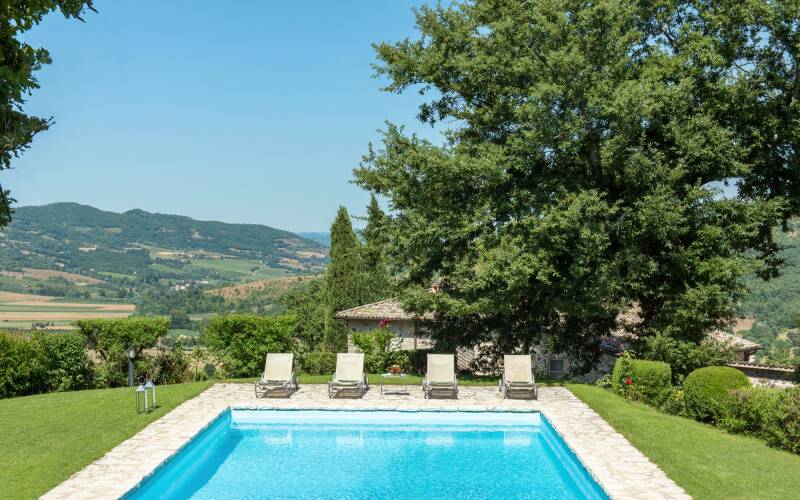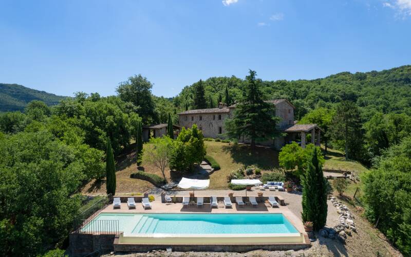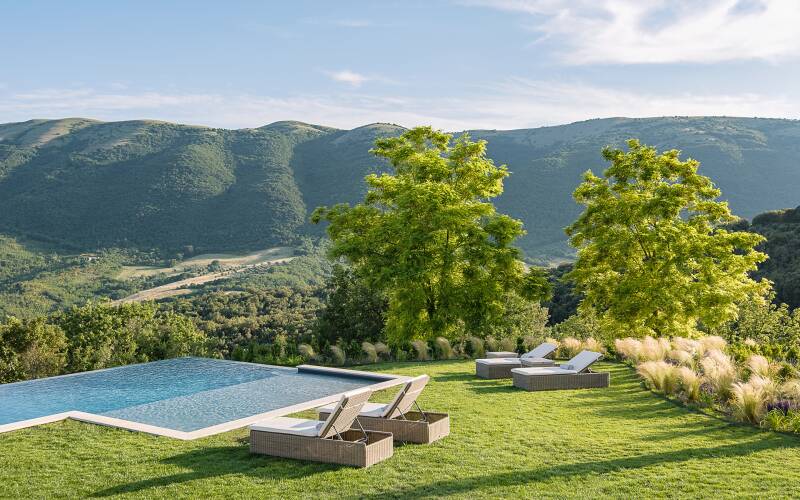 Pumi is a luxury villa on an exclusive Umbrian estate, offering spectacular verdant views over hills and valleys, ideal for those seeking privacy and relaxation. Located near the Antognolla championship 18-hole golf club, 30 minutes away from Reschio, the estate is renowned for its pristine woods and luxurious villas that combine modern comforts with traditional Italian country style. Outdoor areas include an infinity pool and a fully furnished pool house, perfect for al fresco dining and cocktails while enjoying the stunning vistas of the surrounding olive groves and hills.