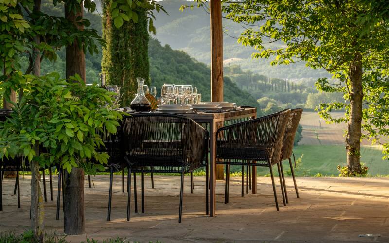 A large, high-end family villa, perfect for golf lovers, with a commanding panoramic view over the tranquil rolling countryside, villa Ada is the ideal spot for all those seeking an authentic and genuine Italian vacation. The property includes a large main villa and an annex, each with its driveway, parking area, and ample privacy—perfect for two families sharing. The villa boasts a raised swimming pool with stunning views, a shaded pergola, and multiple areas ideal for al fresco dining and relaxing by the sunset. Restored to high standards, the villa features prestigious materials like antique doors, oak-beamed ceilings, and terracotta floors, blending luxury and traditional Italian charm while being located just 15 minutes from the Reschio estate.