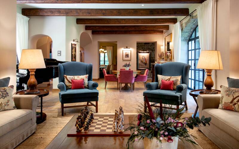 Viandante del Cielo is a former Franciscan convent transformed into a luxury Italian villa by George Lucas, preserving its historic charm while adding modern splendour and elegance. The villa offers panoramic views of Lake Trasimeno, known for its stunning sunsets, and is set on a 60-acre estate with formal gardens, olive groves, and a forest reserve 30 minutes from Reschio. The villa spans 1600 square meters and features 10 bedrooms, a swimming pool, and various outdoor dining spots, comfortably hosting up to 18 adults and 4 children. Additional amenities include a private cinema, gym, sauna, wine cellar with tasting room, and an elegant library building with a games room and ample dining space.