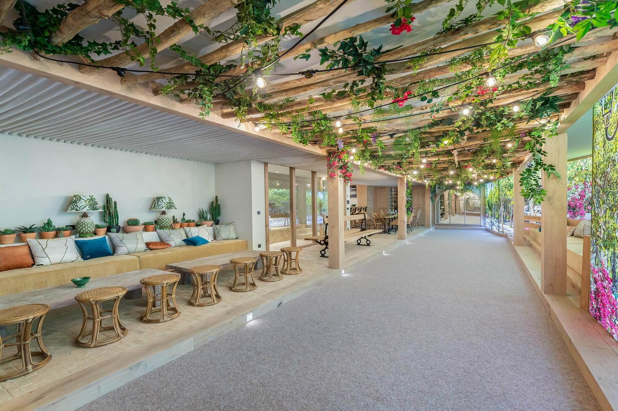 - lounge area by the pool with sandy floor