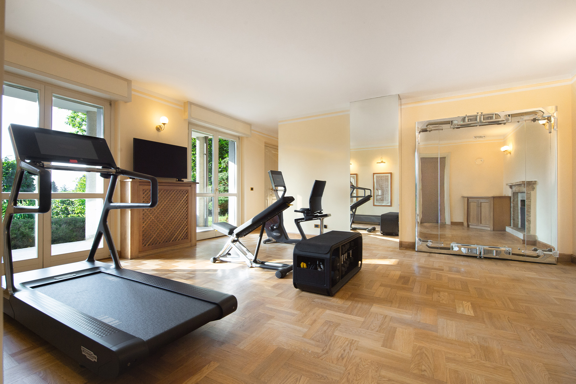 - gym equipment: treadmill, bike recline, kinesis, bench, Technogym bench, dumbbells up to 17.5kg, weighted knuckles up to 1.2kg, wellness ball, foam roller, elastic bands, balance dome