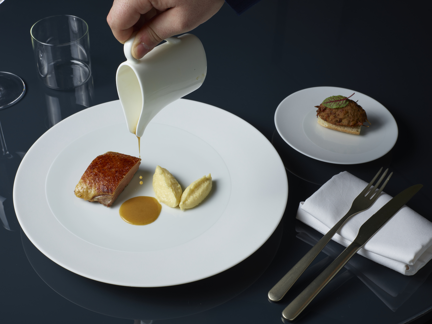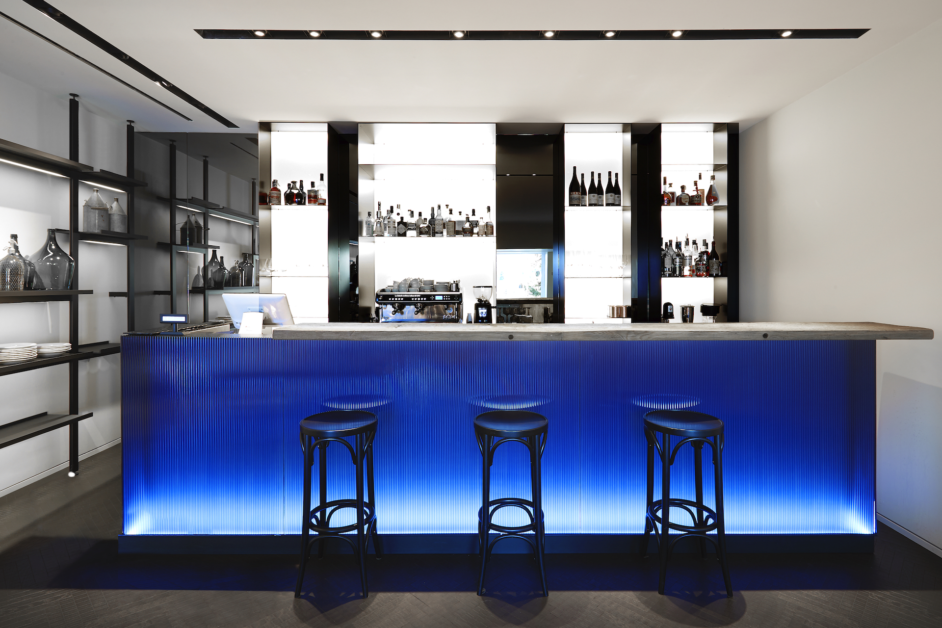 lounge hall with sofas, armchairs and fireplace, French doors opening towards outdoor area with partial view of the lake, dining area with two tables for 10 guests each, professional fully equipped kitchen, bar room with tables, double guest bathroom.