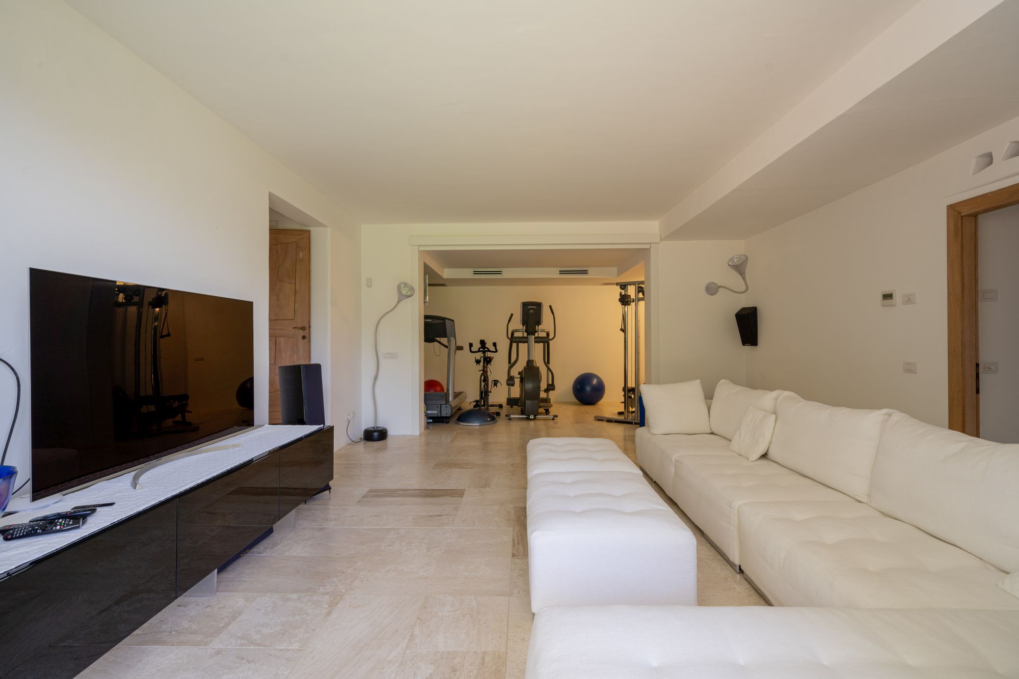 - gym with treadmill, step machine, and weights