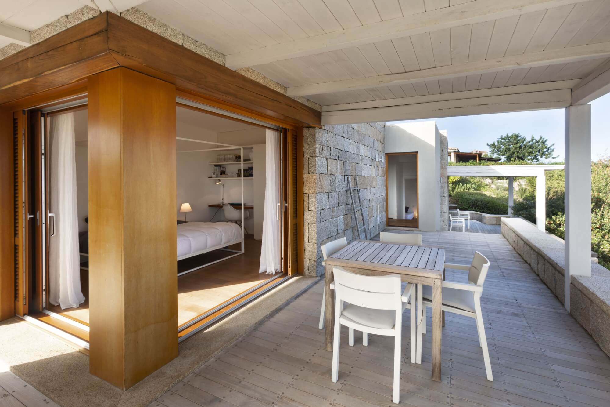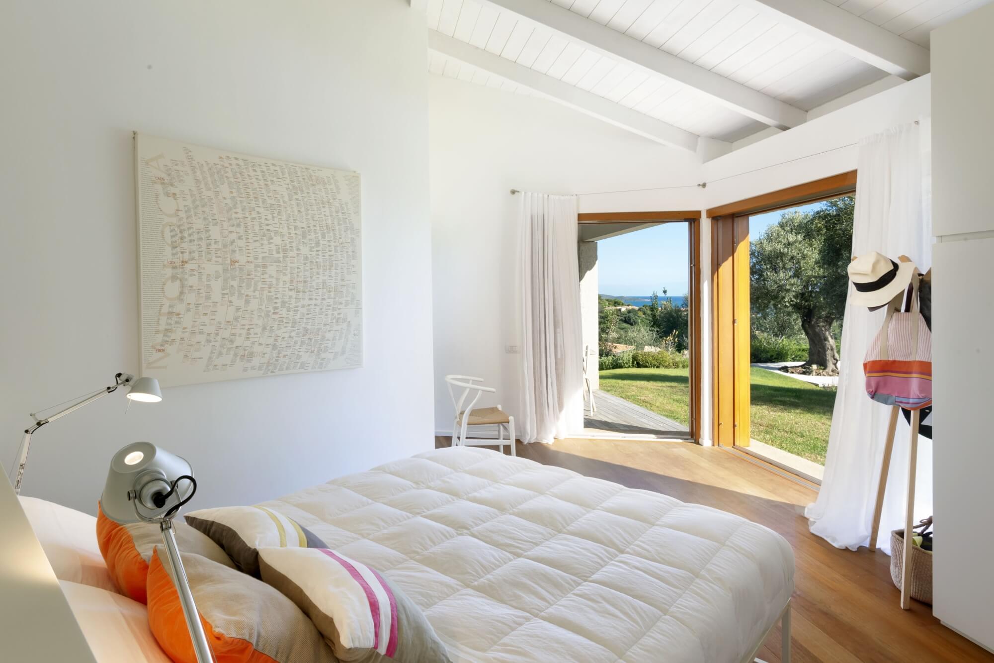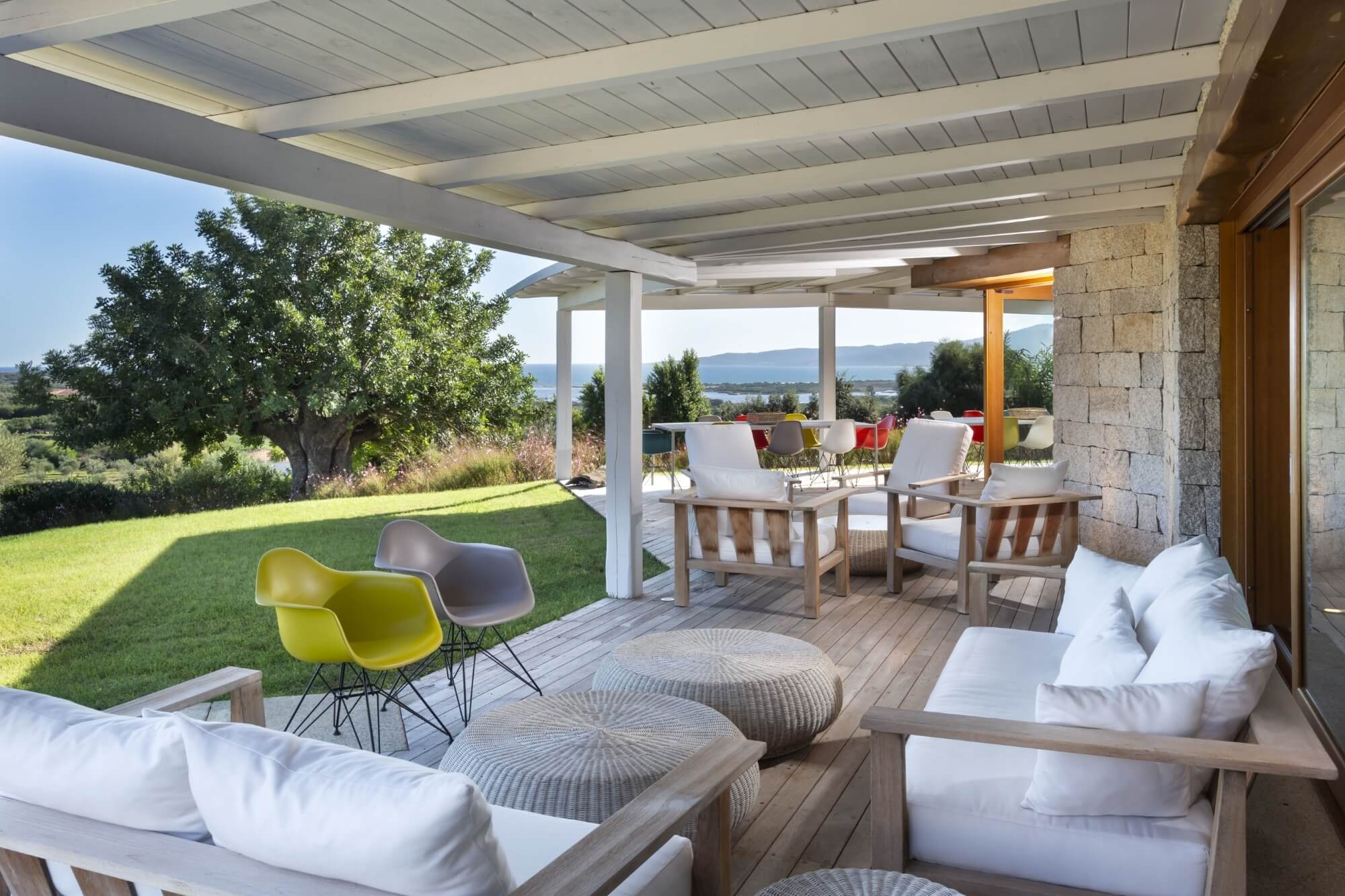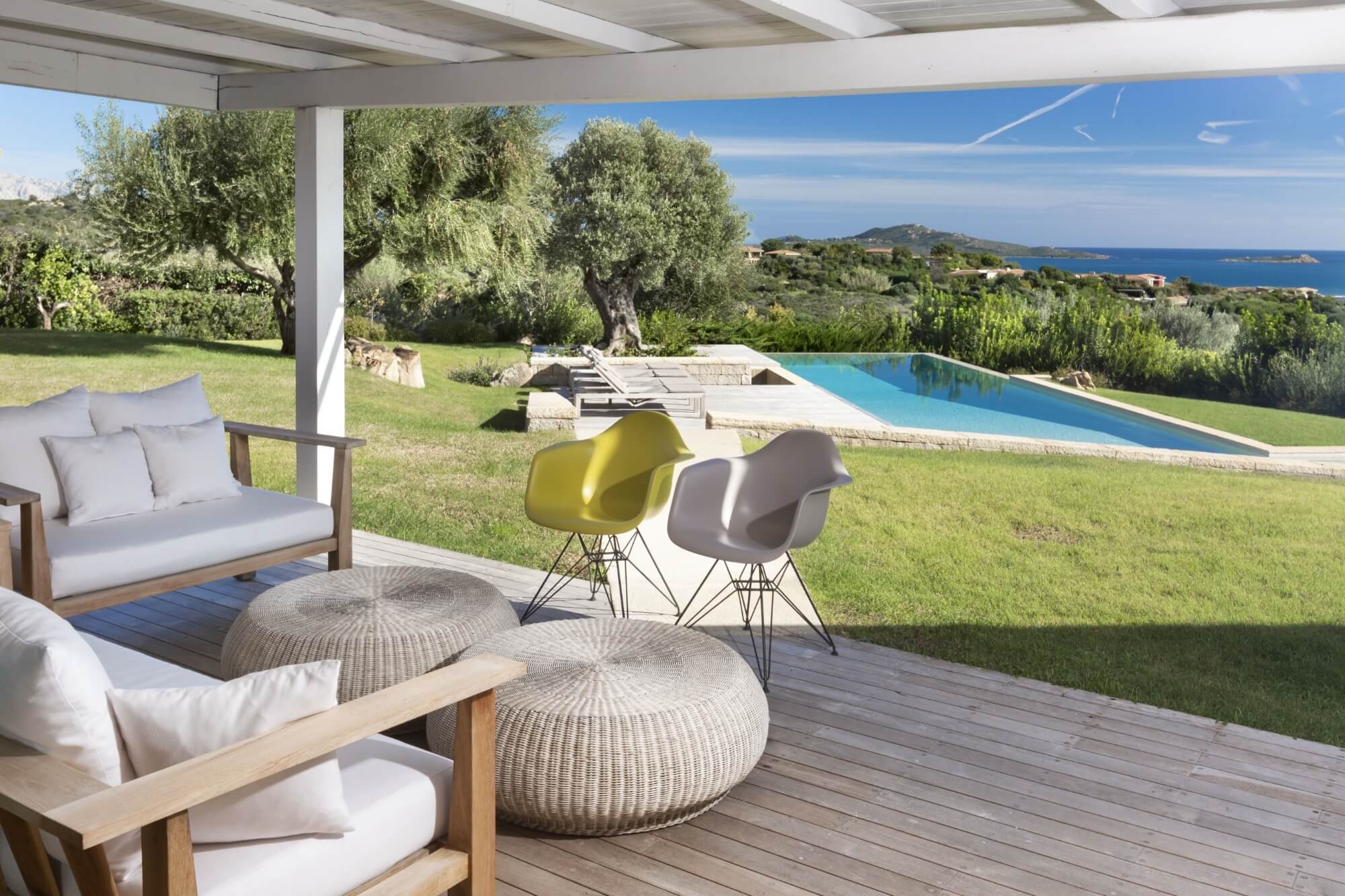 This holiday villa for rent perfect for sea lovers is set amidst a large private garden, providing a tranquil escape with its lush greenery. The majestic private pool invites you for refreshing swims under the Sardinian sun or to enjoy outdoor dining in style with a modern, covered al fresco setup. The sitting area by the pool, adorned with coloured minimal chairs, offers a stunning sea view and is shaded by surrounding trees, creating an idyllic dining experience.