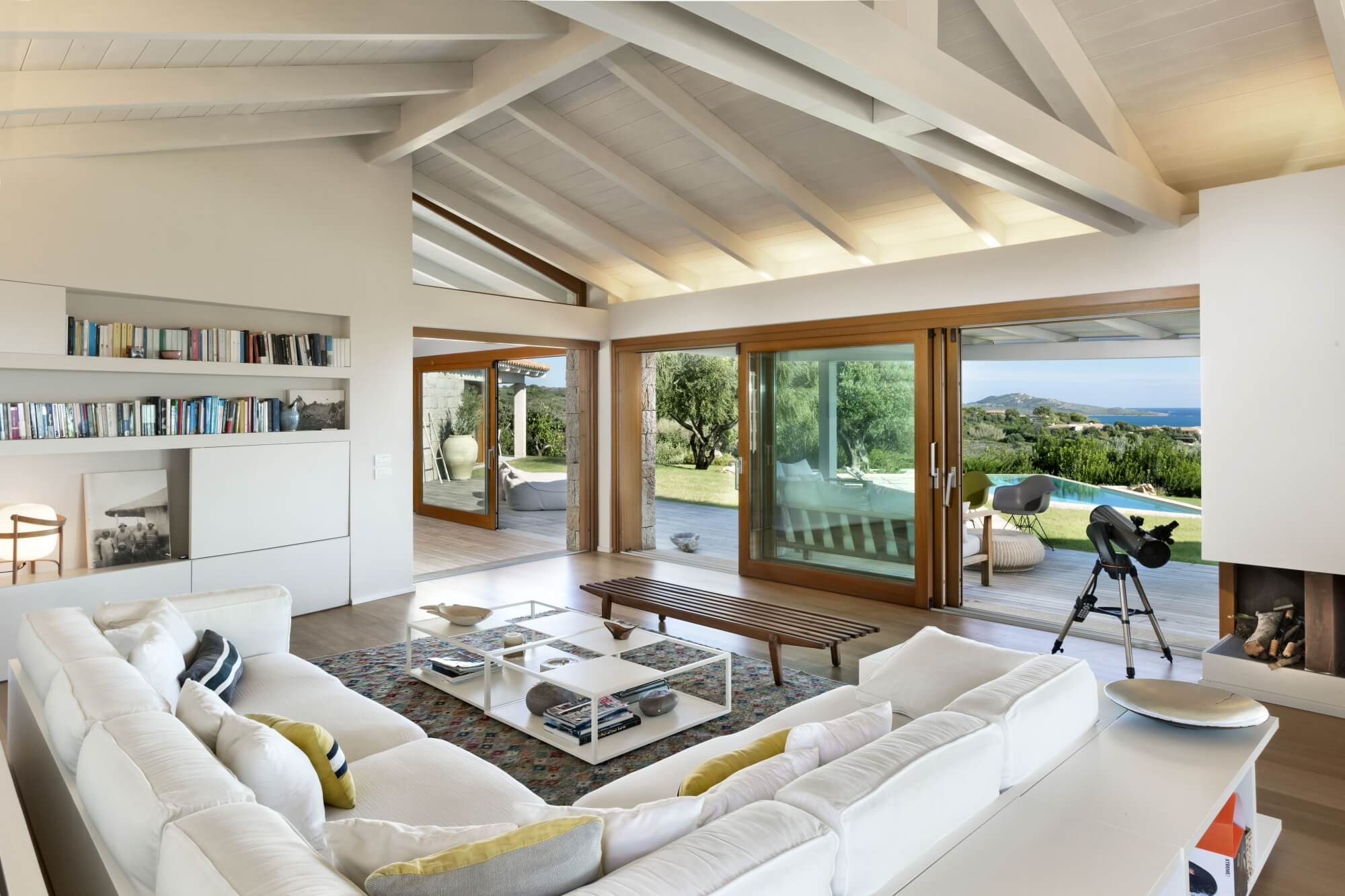 The indoor living room is a showcase of contemporary design, featuring a fireplace and breathtaking French windows that open directly to the outdoor area. This open space seamlessly integrates with a dining area equipped with a gourmet wooden dining table.