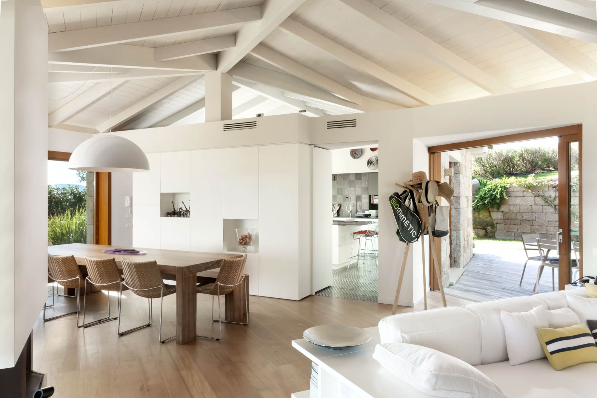 open space with fully equipped kitchen and cooking island with countertop seating 2 guests and direct access to outdoor from both sides, spacious living room with fireplace (decorative), TV and French doors opening to outdoor covered terrace with sea view, dining area with table for 10 guests.