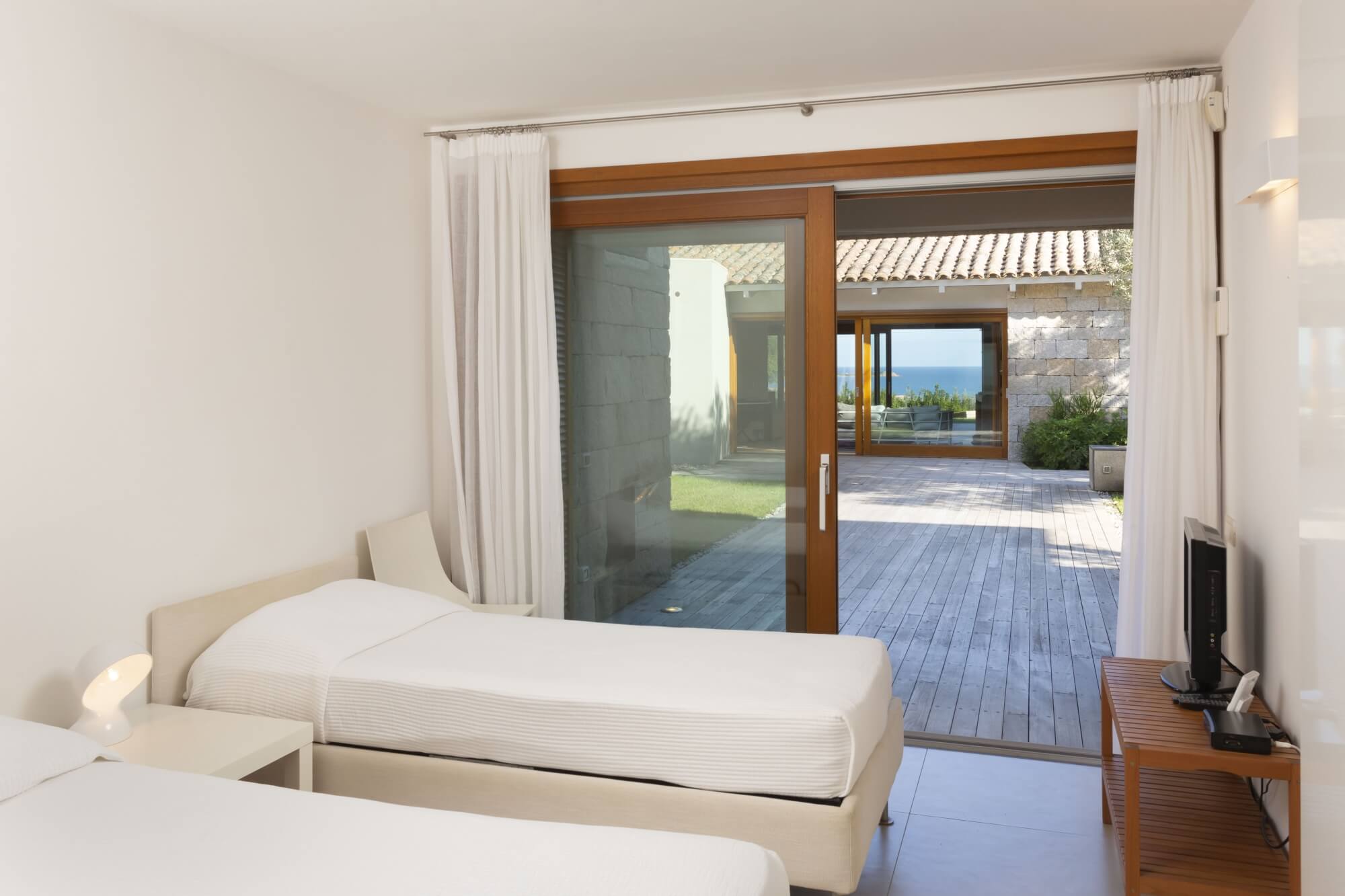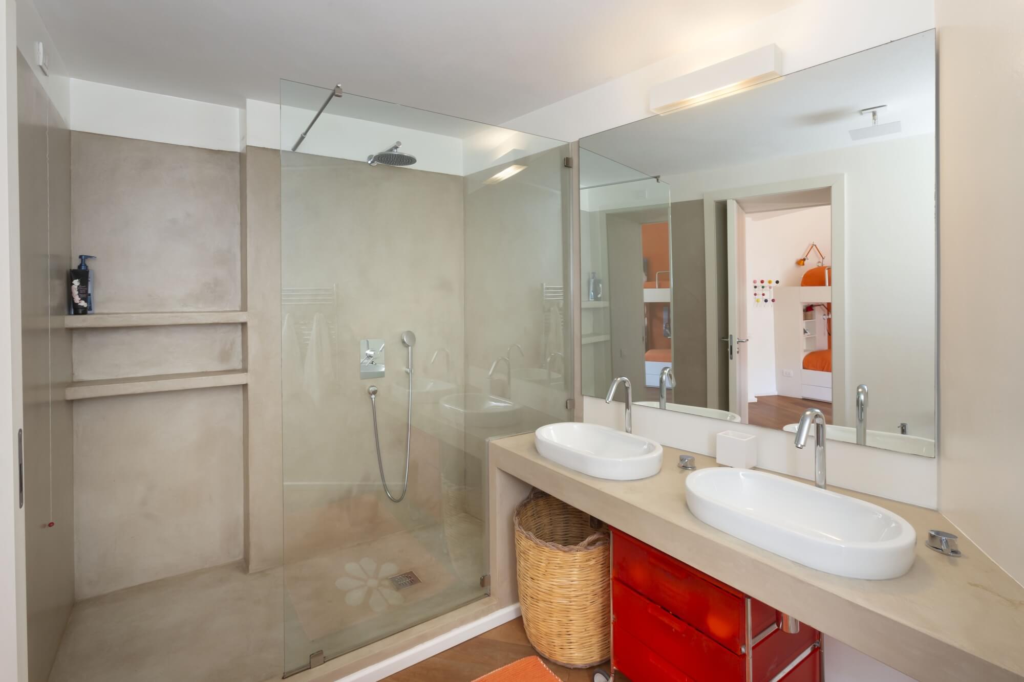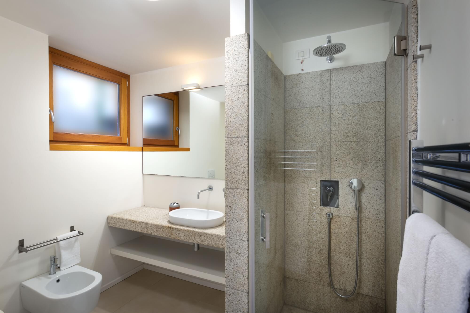 bedroom 2 twin beds (convertible into a double) with direct access to outdoors with sea view, en suite bathroom with large shower cabin (plus extra handheld shower) and bath tub.