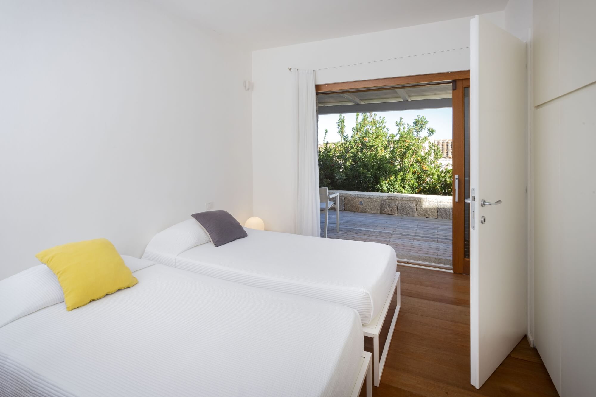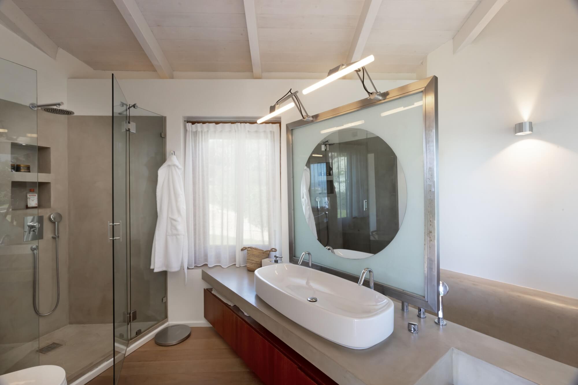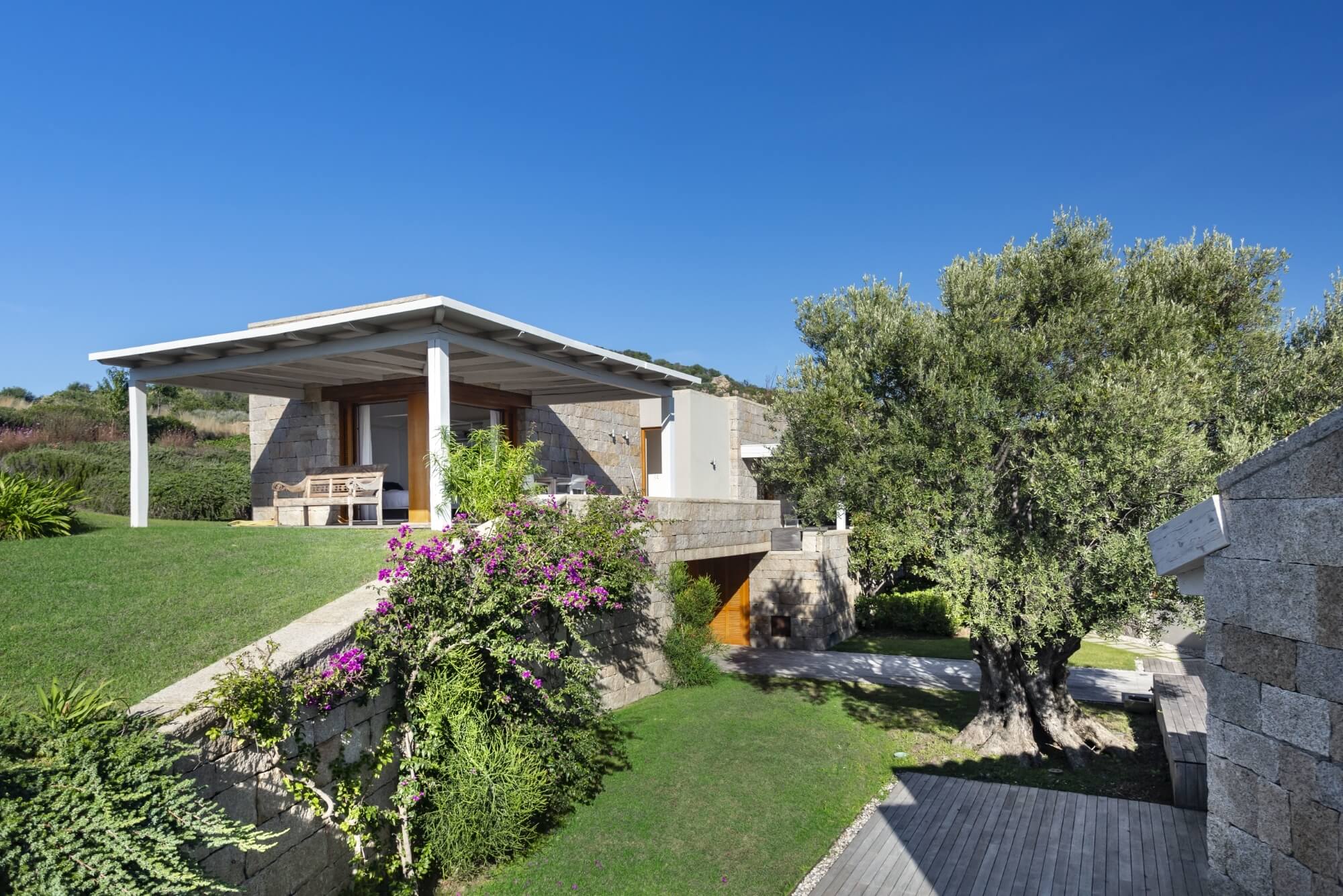 Each bedroom is spacious and bright, featuring modern en suite bathrooms, ensuring utmost comfort and privacy for guests. Villa Nerina features a main villa, including two double bedrooms and a quadruple bedroom with two sets of bunk beds, suitable for children travelling along for a dreamlike family vacation. There are two other guest houses, for a total of three additional bedrooms, each one completed by an en suite bathroom. An additional annex is available for staff travelling along with guests equipped with a double bedroom and a kitchenette.
