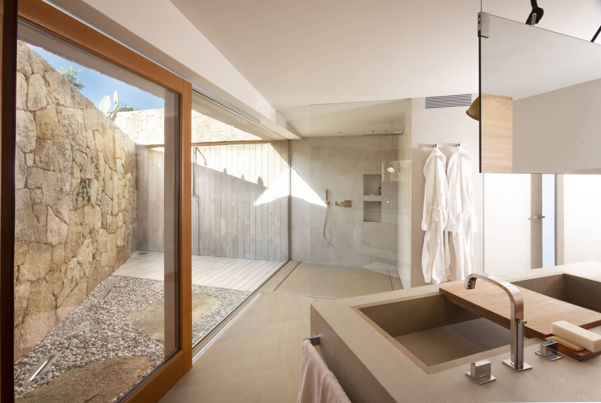bedroom 6 master bedroom (not convertible into a twin) with French windows opening to covered terrace offering sea view, en suite bathroom with double basin, large walk-in shower (plus extra handheld shower). In front of the master there is also an outdoor shower.