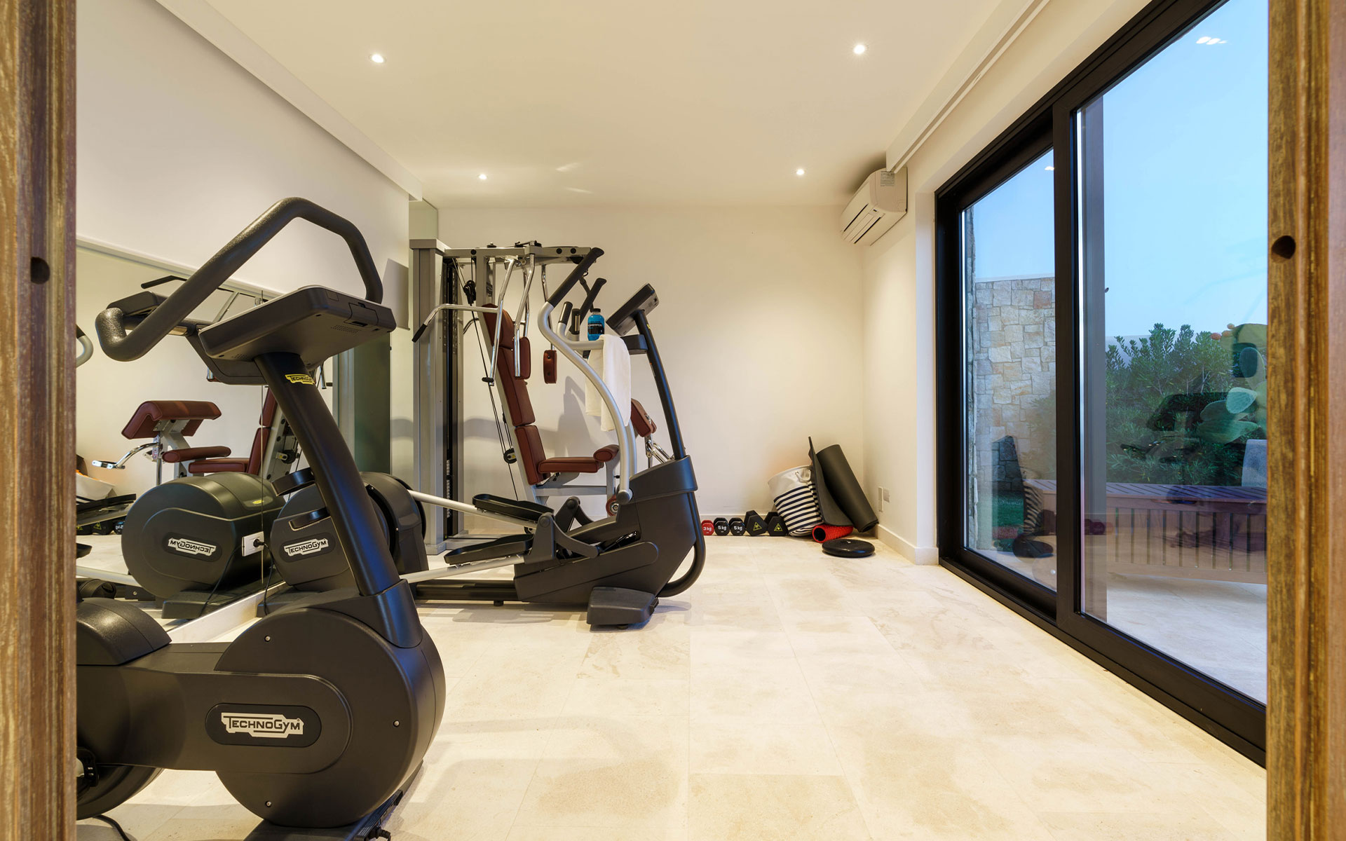- fitness room equipped with cross trainer, cardio bike, multi-function machine, pilates mats, weights