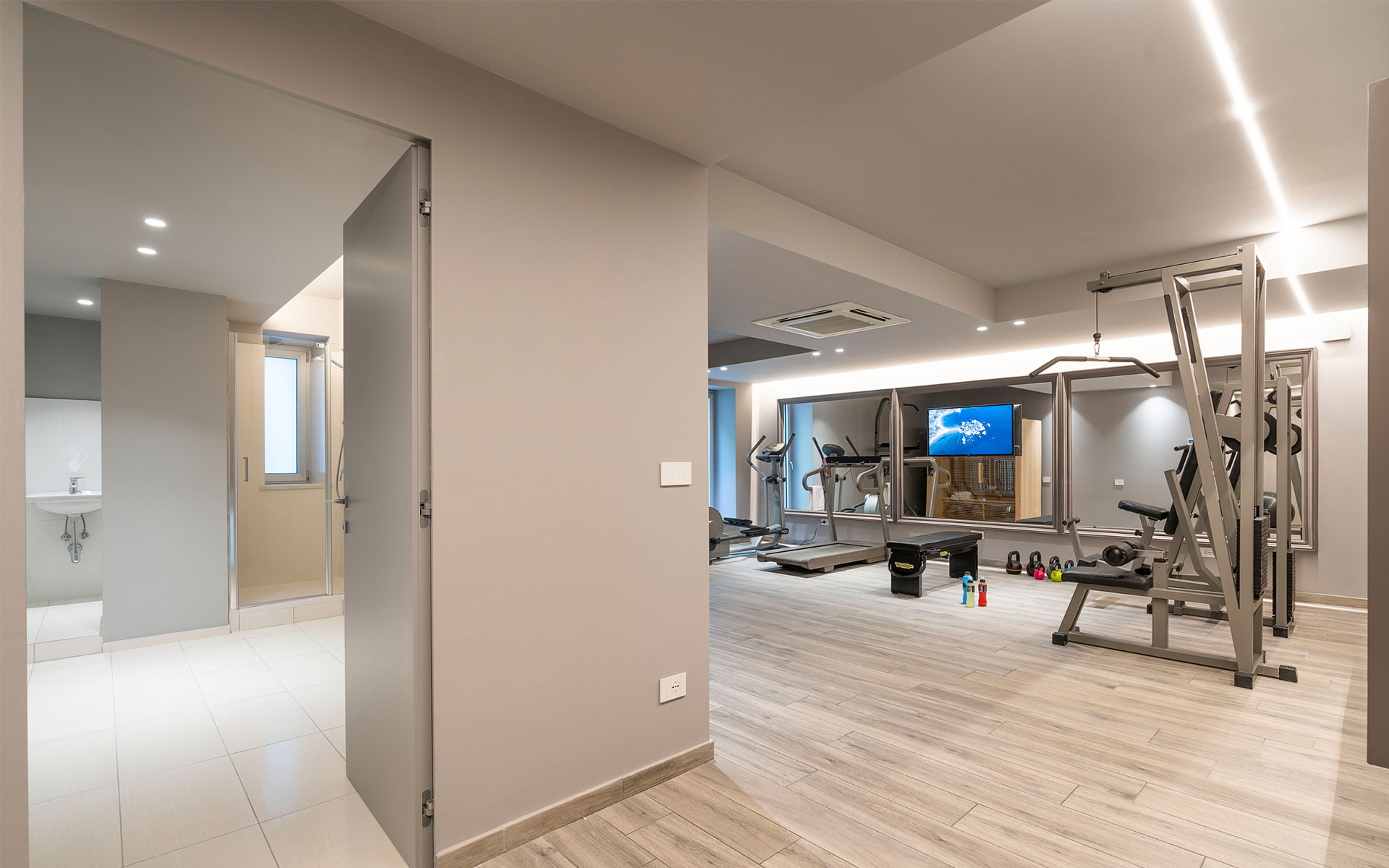 - gym equipped with weights and bench, treadmill, cross trainer