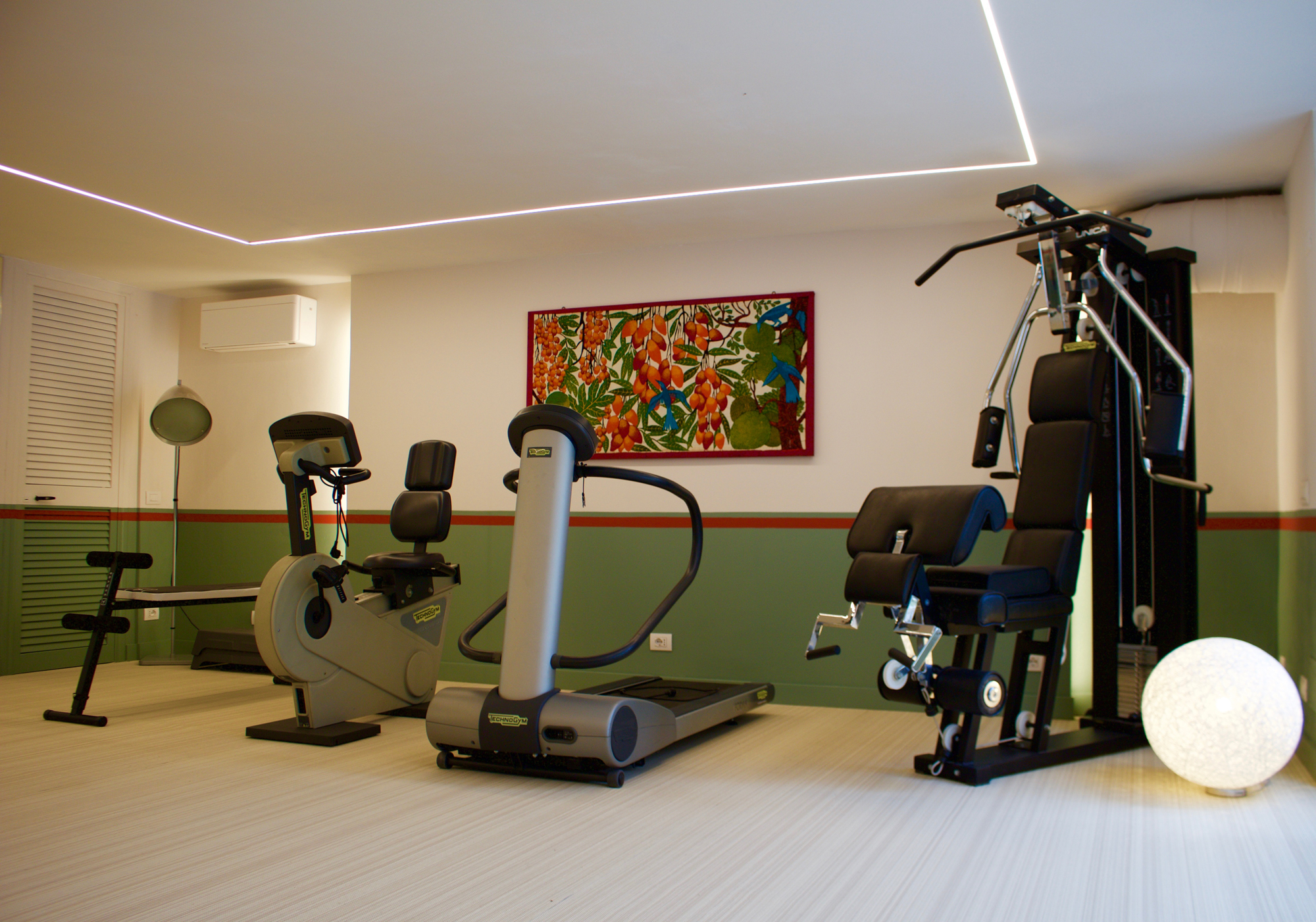 - gym 40 m2 equipped with 2 cardio bikes, treadmill, weight bench, 2 flying yoga, pilates stations and rowing machine