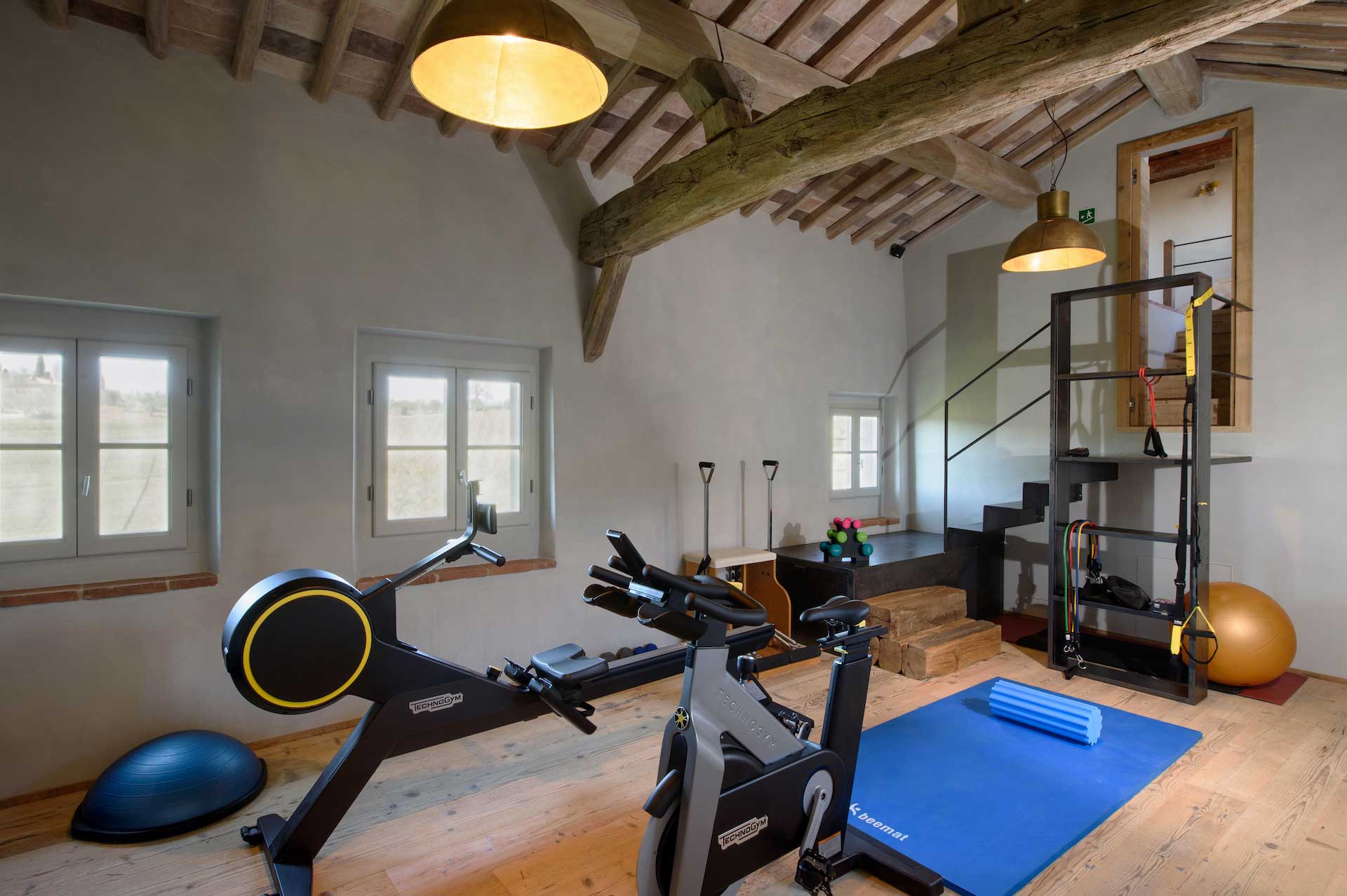 - gym with exercise bike, weights, Pilates equipment, rowing workout machine