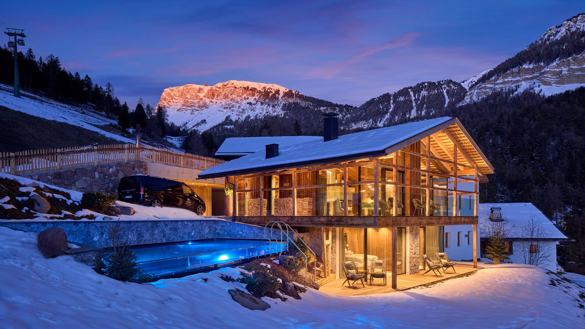 This luxury chalet for weekly rentals is directly connected to the ski slope and surrounded by a hiking paradise, where nature puts on an impressive show itself. Chalet Arte was designed to be a place of energy, where guests can regenerate and leave the hectic world behind for a while. Spread over three floors, the chalet is equipped with three bedrooms; traditional elements are combined with a modern design, chic details, and plentiful pieces of art from all over the world, giving the property a very special character. Ski enthusiasts will be thrilled to have a special ski instructor, the world champion Isolde Kostner, for a guided tour on the slopes for one day.