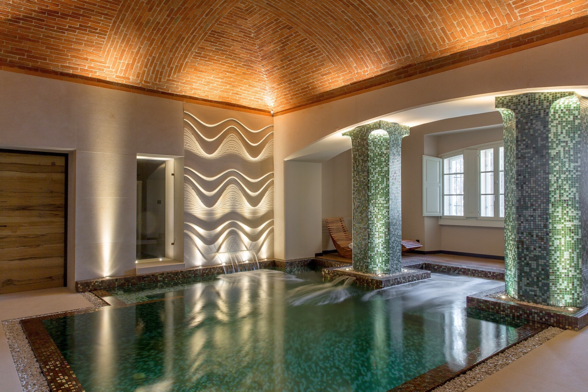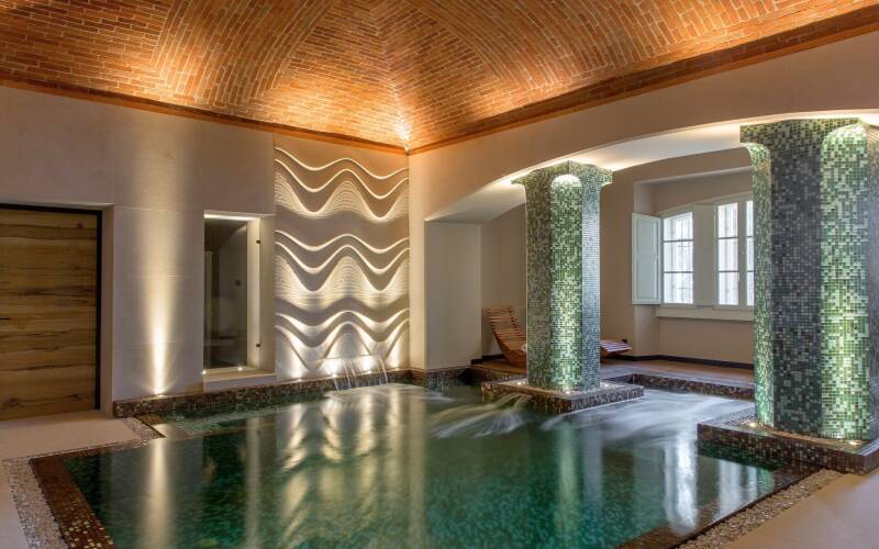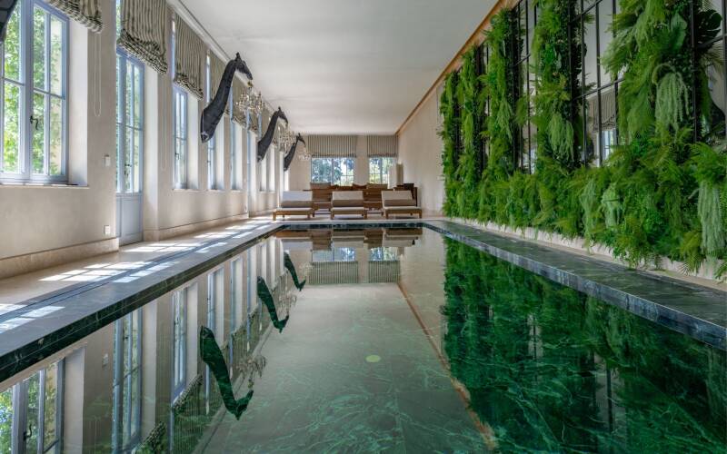 Villa Cristalli stands as an elegant Tuscan retreat, a restored 1930s residence filled with luminous marble, refined décor, and serene garden views that create an atmosphere of quiet luxury. Its centrepiece is a magnificent heated indoor pool set within a private spa where soft lighting and warm water invite long, indulgent moments of relaxation.